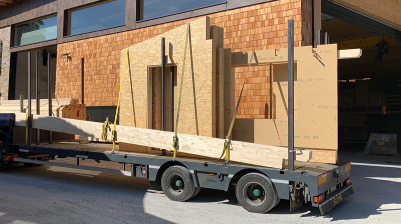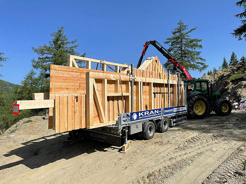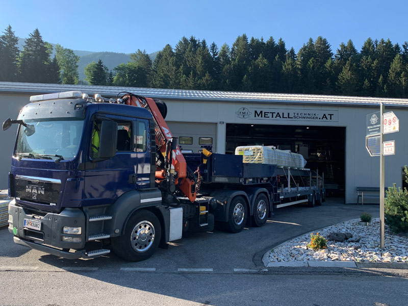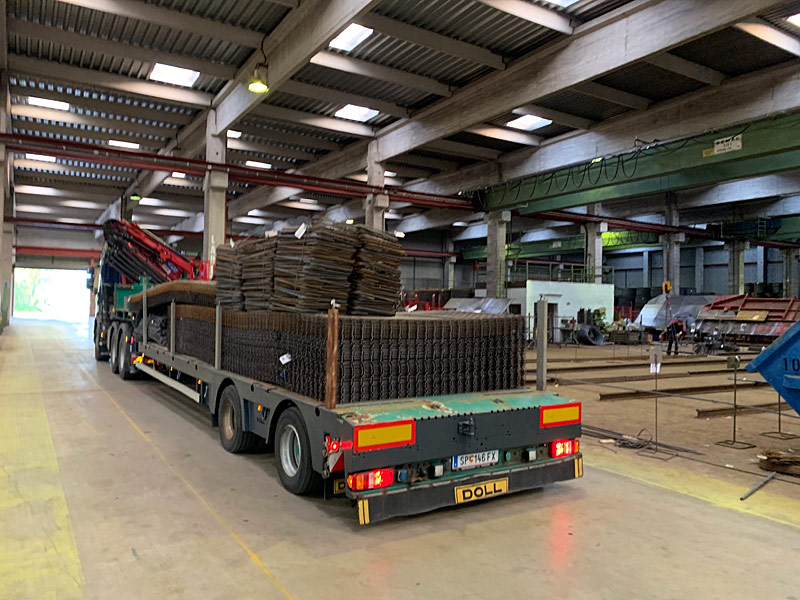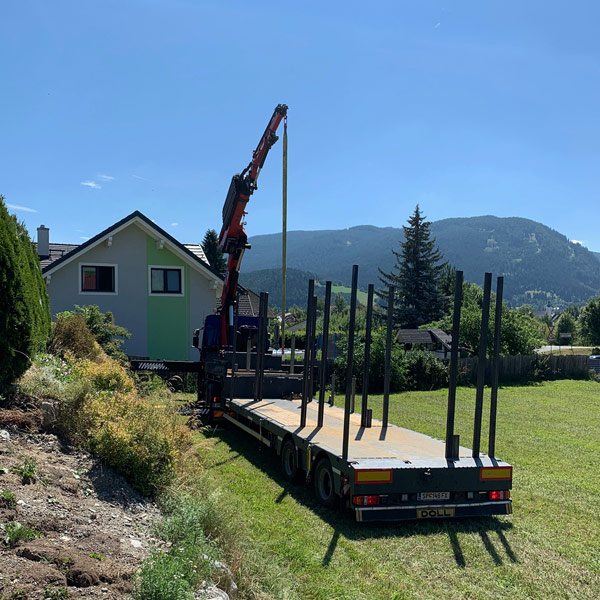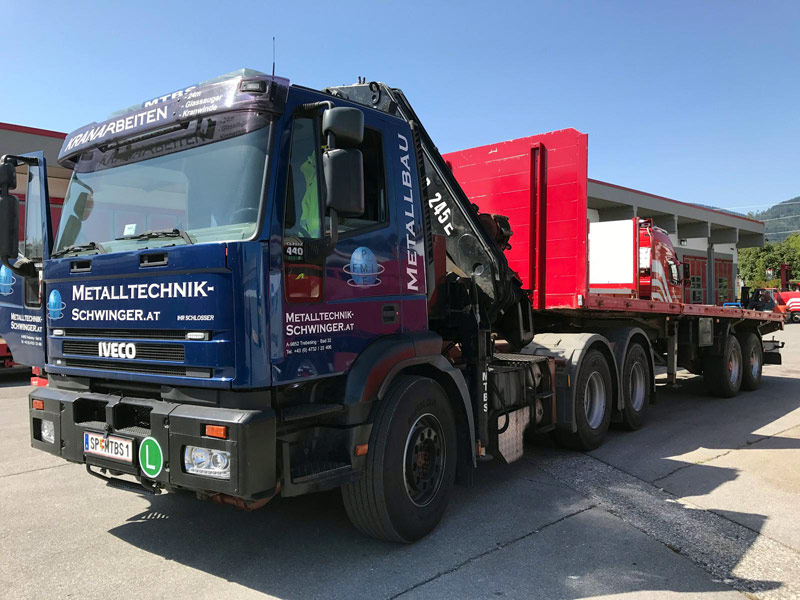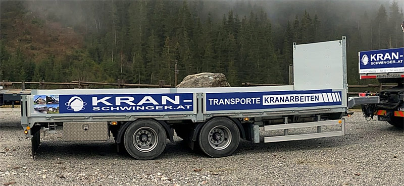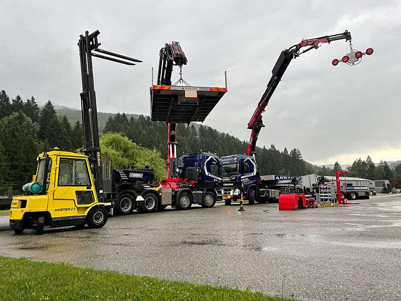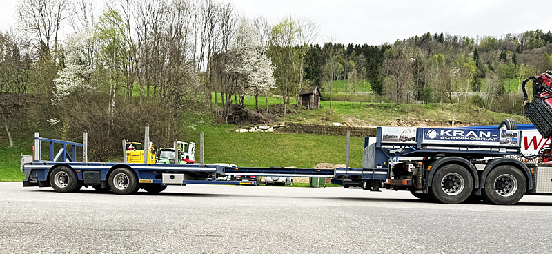 Sondergenehmigung für Stückteile bis 22m, 44 Tonnen Gesamtgewicht, Breite 3,2m, Höhe 4,2m, Ladelänge Hochplateau 3,3m, Ladefläche 6,8m plus TELE 4,2m, Ladehöhe 850mm, Bauteilhöhen bis 3,4m (auf genehmigten Straßen), zwei Achsen zwangsgelenkt und separat per Funk steuerbar.